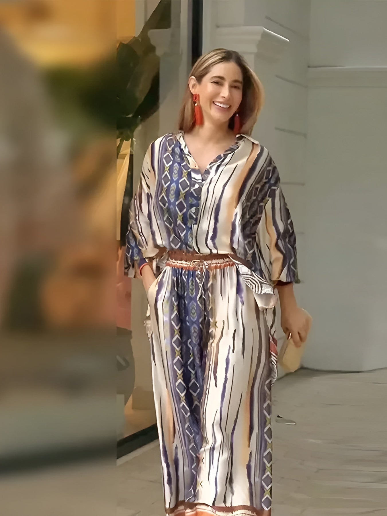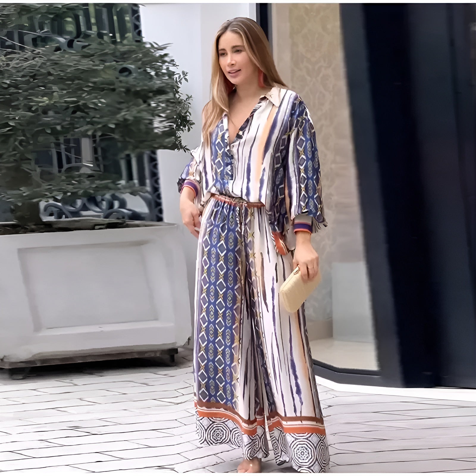The Vero set brings together striking prints and flowing lines for a confident, comfortable look. Designed with a button-down top, elastic belted waist, and wide-leg pants, this outfit makes a statement without sacrificing comfort. Perfect for brunches, creative workspaces, or casual evenings out.