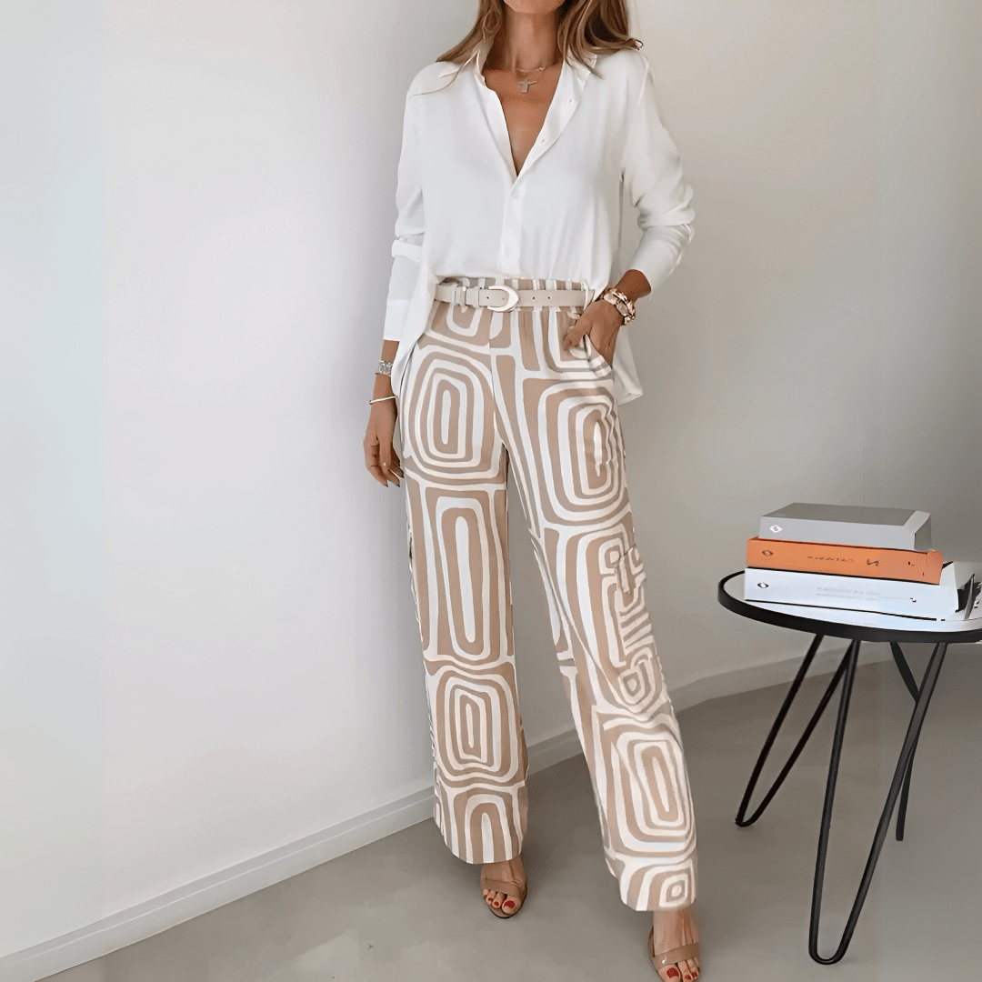 Giulia is the go-to set for the woman who loves effortless elegance, modern design, and comfortable versatility. Featuring a stylish blouse and tailored trousers, this two-piece transitions seamlessly from brunch dates to business meetings with polished confidence. Complete with a relaxed fit, statement belt, and eye-catching geometric print, this set makes getting dressed feel effortless and elevated — all day long.